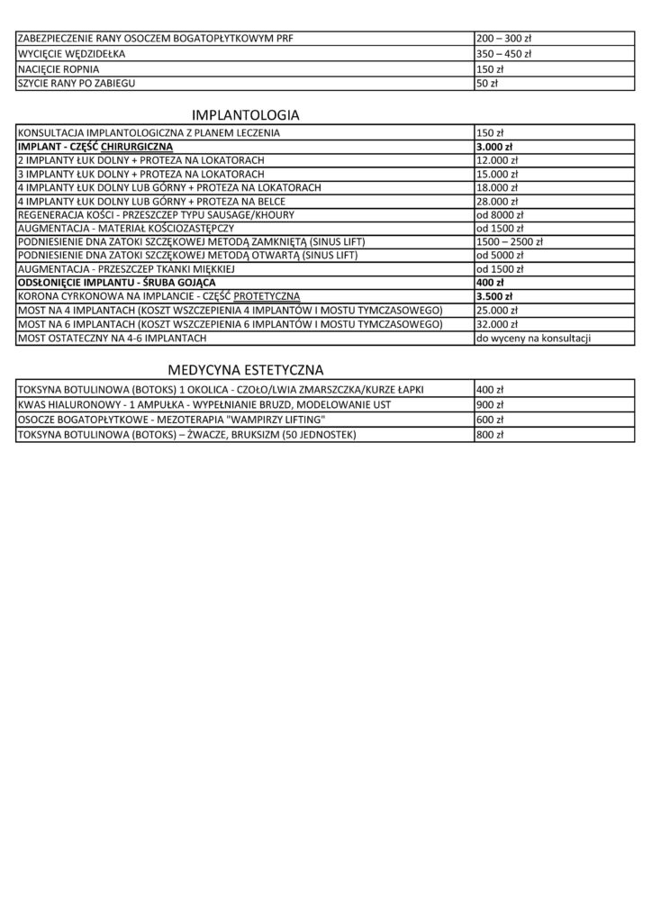 Miło nam poinformować, że zgodnia z naszą misją i w trosce o najwyższą jakość usług, nasi doświadczeni lekarze stosują materiały i sprzęt renomowanych firm i sprawdzonych producentów. Wszystkie prace protetyczne wykonujemy we współpracy z najlepszymi labolatoriami protetycznymi, dzięki czemu zagwarantowana jest jakość i estetyka prac. W całym procesie leczenia otaczamy naszych Pacjentów opieką i troską, aby czuli się maksymalnie komfortowo. Wszystkie procedury wykonujemy w znieczuleniu, które dla naszych Pacjentów jest zawsze bezpłatne. Stawiamy na przejrzystość i transparentność – poniżej przedstawiamy pełny cennik: